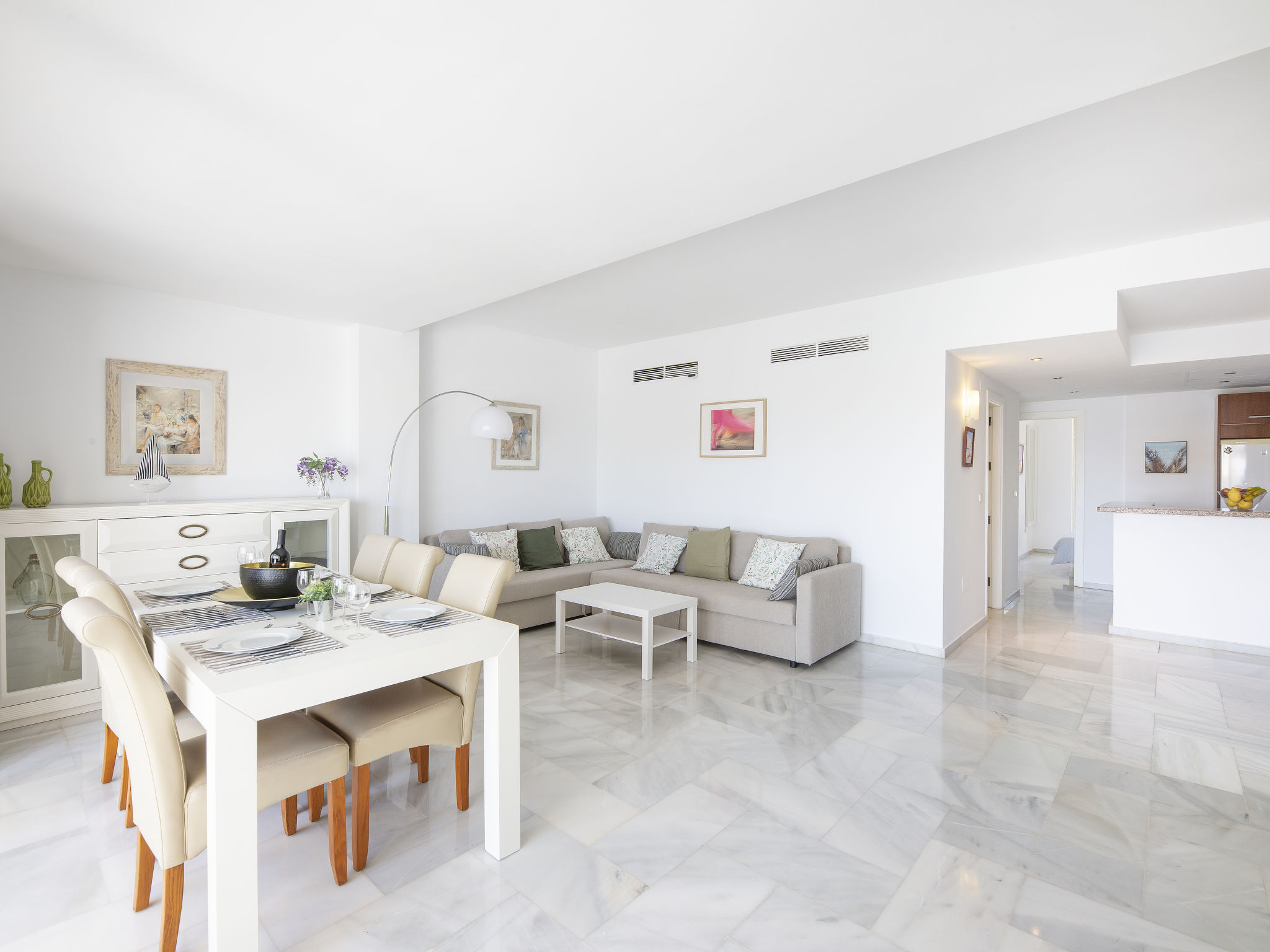 «Puerto Marina», apartamento de 3 habitaciones 100 m2 en el 1° piso. Vivienda adecuada para 4 adultos + 2 niños. Con mobiliario bonito y lujoso: salón-comedor con 1 sofá-cama, TV digital y pantalla plana. Salida a la terraza, orientación sur. 1 dorm. doble con 1 cama de matrimonio (150 cm). 1 dorm. doble con 2 camas (90 cm). Cocina abierta (horno, lavavajillas, 4 placas de vitrocerámica, microondas, congelador). Baño/bidet/WC, ducha/WC. Terraza. Muebles de terraza, tumbonas. Vista espléndida al puerto. El alojamiento dispone de: lavadora. Internet (Wifi, gratis). Adecuado para familias. VFT/MA/52689